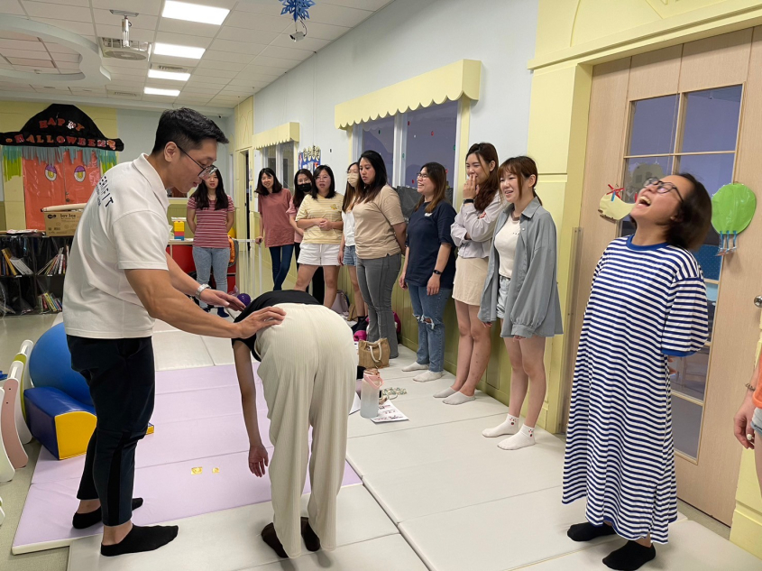 現場也帶著大家一起做伸展與簡單肌力,一步步示範托嬰中心環境中就能完成的小動作,讓同仁在忙碌照顧孩子之外,也有機會好好照顧自己的身體。